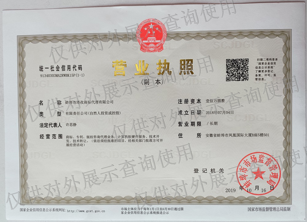 蚌埠市塔孜商標(biāo)代理有限公司是國(guó)家商標(biāo)局備案的商標(biāo)代理機(jī)構(gòu),是安徽省規(guī)模較大的商標(biāo)事務(wù)所,主要從事國(guó)內(nèi)、國(guó)外知識(shí)產(chǎn)權(quán)代理工作,服務(wù)范圍包括:商標(biāo)咨詢(xún)、查詢(xún)、設(shè)計(jì)、注冊(cè)、續(xù)展、變更、轉(zhuǎn)讓、商標(biāo)維權(quán)和涉外代理,資質(zhì)辦理,版權(quán)注冊(cè),專(zhuān)利申請(qǐng)等。公司總部設(shè)于蚌埠市,在江蘇、安徽等十多個(gè)地市設(shè)有正規(guī)分公司,公司現(xiàn)有商標(biāo)代理人四十多名,專(zhuān)職律師兩名,商標(biāo)代理人均有專(zhuān)業(yè)學(xué)位,其中多名商標(biāo)代理人長(zhǎng)期為我省數(shù)十家大型企業(yè)提供商標(biāo)代理工作···